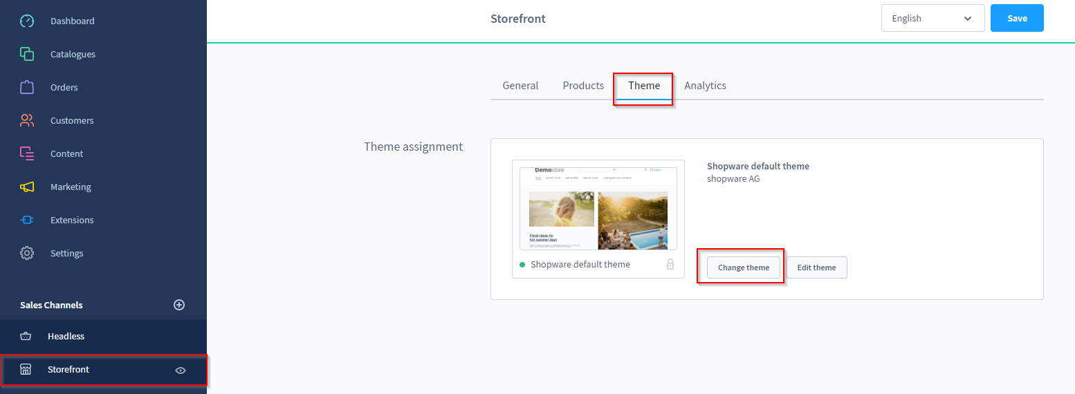 Klicke dafür in der Navigation auf Deinen Verkaufskanal und wecheln auch hier in den Reiter "Theme."