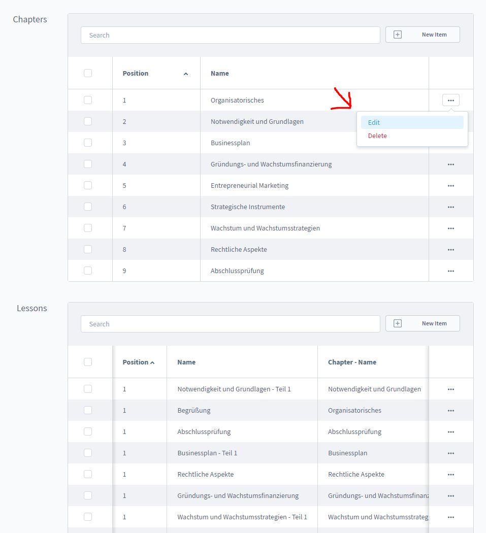 Klicke auf Neu um ein Kapitel oder eine Lektion zu erstellen.