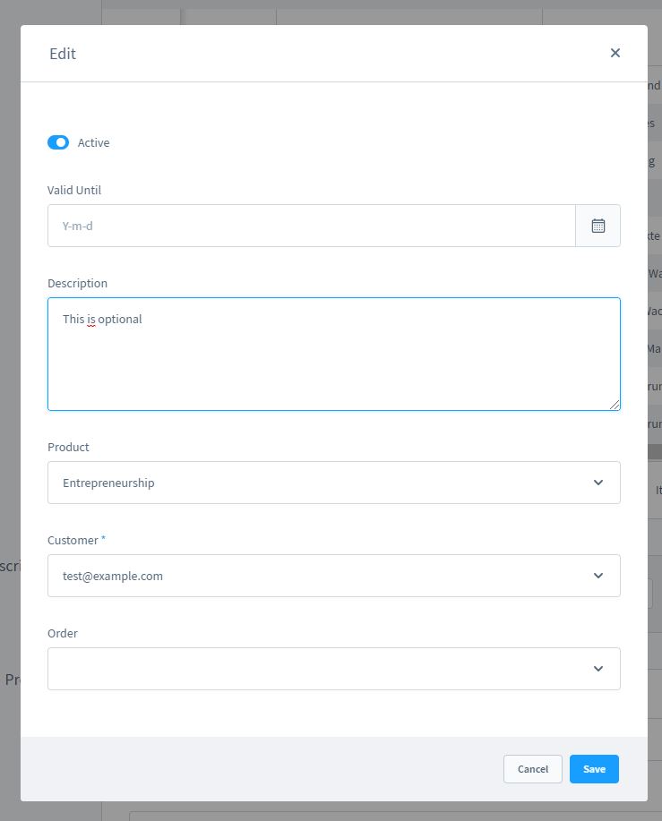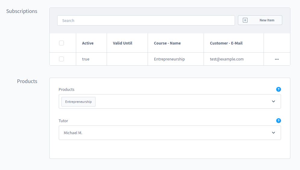 Nach dem Speichern erscheinen weitere Optionen: 1. Kapitel - Eine Übersicht aller Kapitel in dem Kurs 2. Lektionen - Eine Übersicht aller Lektionen in dem Kurs 3. Abos - Eine Übersicht aller Buchungen des Kurses 4. Produkte - Trage hier die Produkte ein, die den Kurs repräsentieren