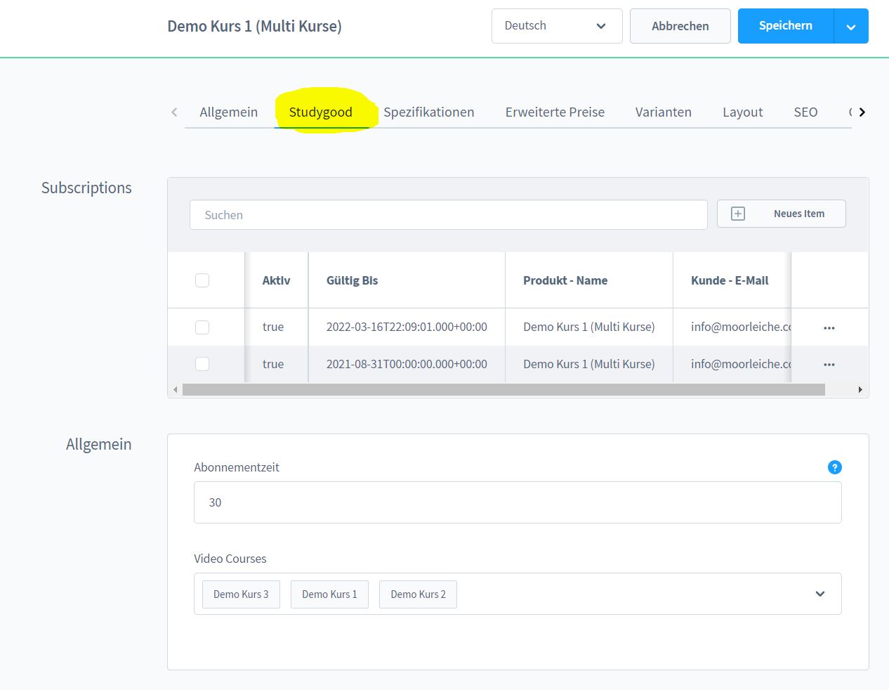 Hier findest du die Subscriptions, die verknüpften Kurse und die Meta-Informationen des Produktes.
