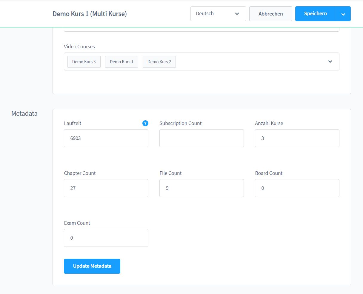 Du kannst die Metadaten zum Produkt manuell anpassen oder diese automatisch aktualisieren. Beim Aktualisieren werden die Kurse auch neu Indexiert, deshalb solltest du jedes Mal wenn Du Änderungen an einem Deiner Kurse vornimmst, diesen Button dazu nutzen.